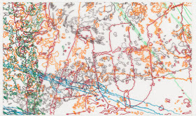 I was through at the Edinburgh Festival last week and stumbled across an exhibition by New York artist Ingrid Calame. She makes art by tracing marks and stains she finds on the ground - sounds crazy but her drawings are really beautiful! She uses sheets of architectural Mylar (top quality tracing paper) to trace marks on the ground such as stains, cracks and graffiti which she takes back to her studio and re-traces using coloured pencils. She layers up the sheets of traced drawings to create what she calls a 'constellation', like the example above.